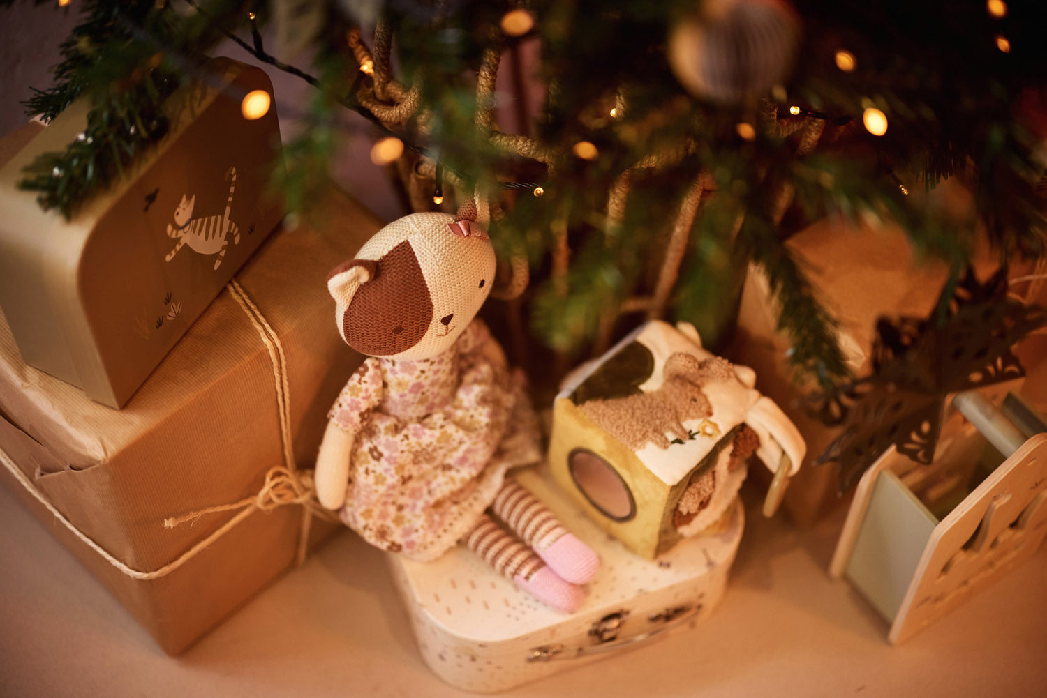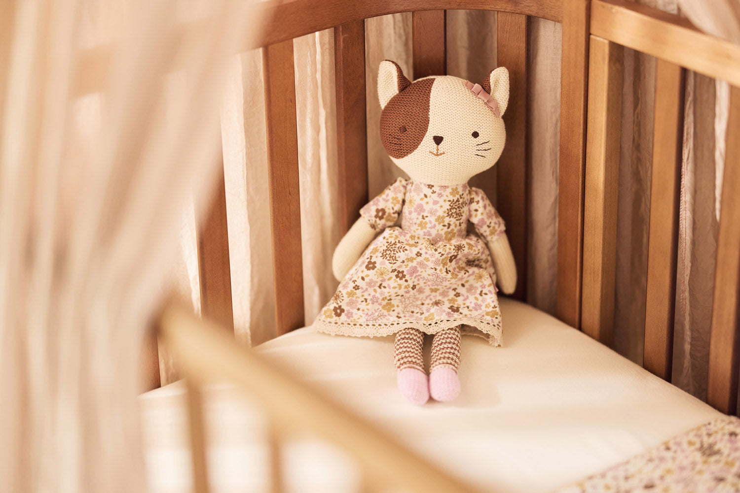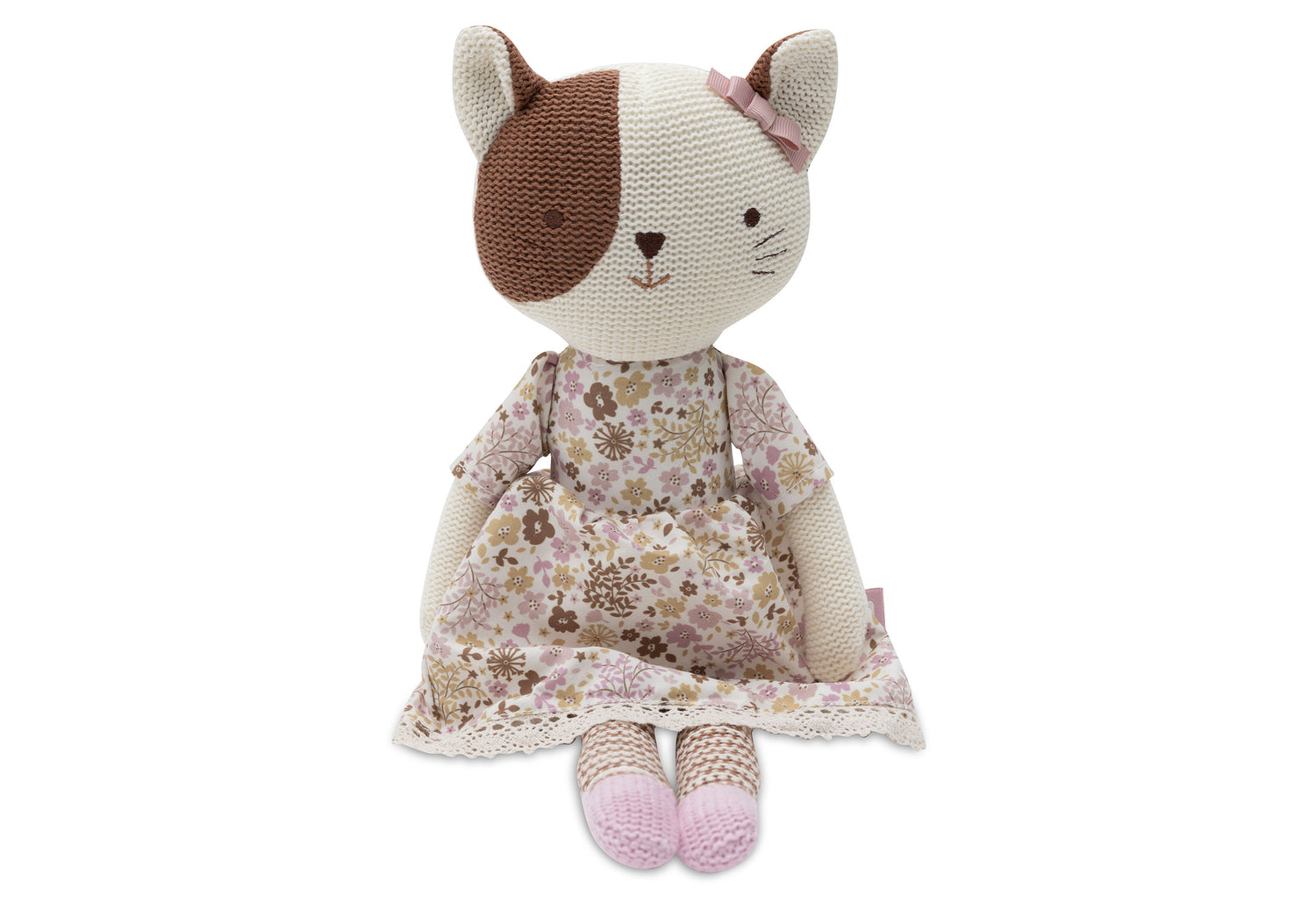 This adorable cuddle toy is ready for hugs and adventure! Its soft knitted body makes it perfect for snuggles, and it sits upright, making it a lovely nursery decoration too. The ideal plush friend for your little one!
