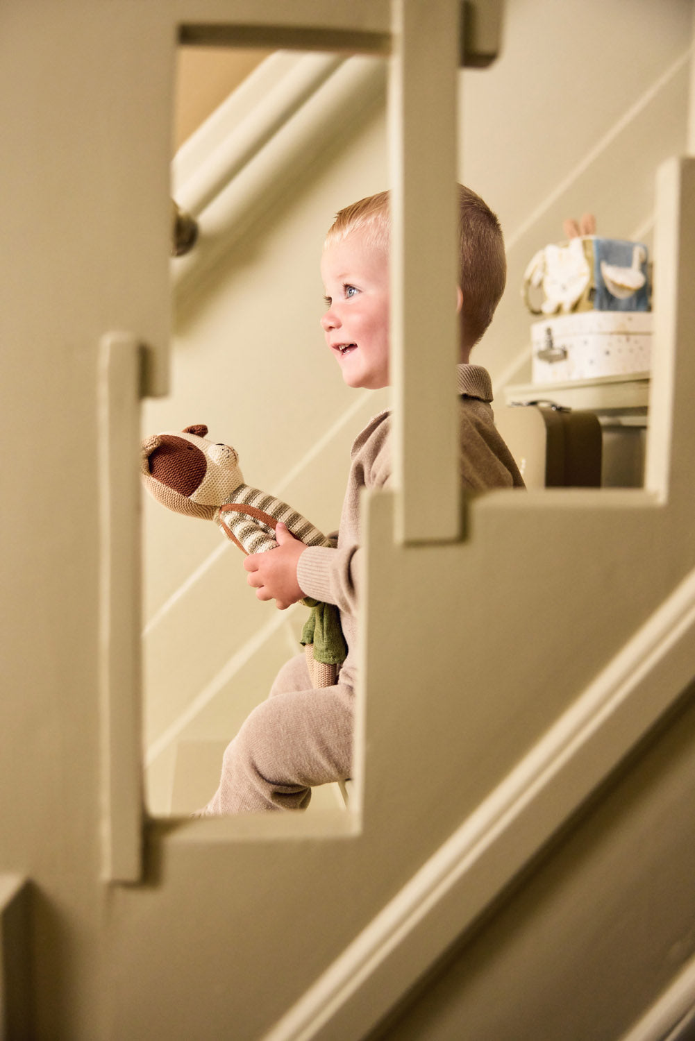 This adorable cuddle toy is ready for hugs and adventure! Its soft knitted body makes it perfect for snuggles, and it sits upright, making it a lovely nursery decoration too. The ideal plush friend for your little one!